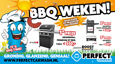 Kom in de maand juli uw auto wassen bij Perfect Carwash Enschede, laat uw gegevens achter bij de kassa en maak kans op prachtige BBQ prijzen! ?Daarnaast ontvangt u bij elke wassing een kortingsvoucher t.w.v. 10% voor BBQ-producten die u kunt inleveren bij de winkel van Roost Buiten Koken! Wilt u meer informatie over onze vestigingen en acties? Bekijk dan onze website www.perfectcarwash.nl