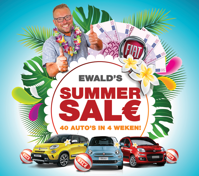 Volgens Ewald Aaltink werd het weer eens tijd voor een spraakmakende actie. Zo’n actie met echt veel voordeel vergelijkbaar met zijn actie in 2012 “Ewald moet er 70 kwijt”. Hierover ging hij in overleg met Fiat Nederland waardoor de actie: Ewald’s Summer Sale is ontstaan. Een maximum van 40 auto’s wordt door Fiat Nederland financieel zwaar ondersteund in de maand juni waardoor de aankoop van een nieuwe Fiat nog nooit zo interessant heeft kunnen zijn. Deze super aanbieding geldt enkel en alleen bij Auto Aaltink in Nijverdal en mits kentekenregistratie in de maand juni.
